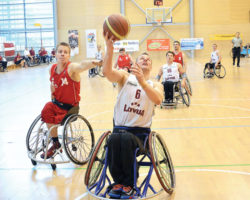 Eiropas meistarsacīkstēs ratiņbasketbolā Brno pirmo reizi pirmajā līgā cīnījās arī mūsu basketbolisti. Debija bija laba — deviņu komandu konkurencē latvieši ieguva sesto vietu, pieveicot Grieķijas un Horvātijas komandas. Attēlā — kā allaž komandas uzbrukuma smailē vienības kapteinis un spēlējošais treneris Raimunds Beginskis.