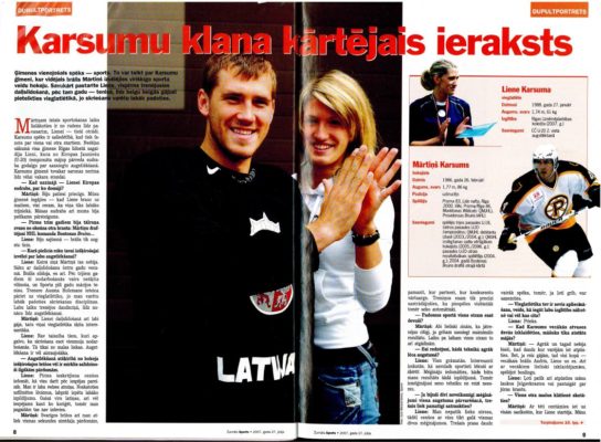 Hokeja svētki šogad izpaliek, taču vai atminaties, ka Latvijas izlases hokejista Mārtiņa Karsuma māsa Liene Karsuma-Viļumsone 2007. gada vasarā Eiropas U-20 čempionātā Holandē izcīnīja sudrabu augstlēkšanā? Ar jaunu personisko rekordu – 1,82 m! Ielūkojamies žurnāla "Sports" arhīvā, kur rubrikā "dubultportrets" Karsumi stāsta par ģimenes vienojošo spēku – sportu –, un, protams, par brāļu un māsu…